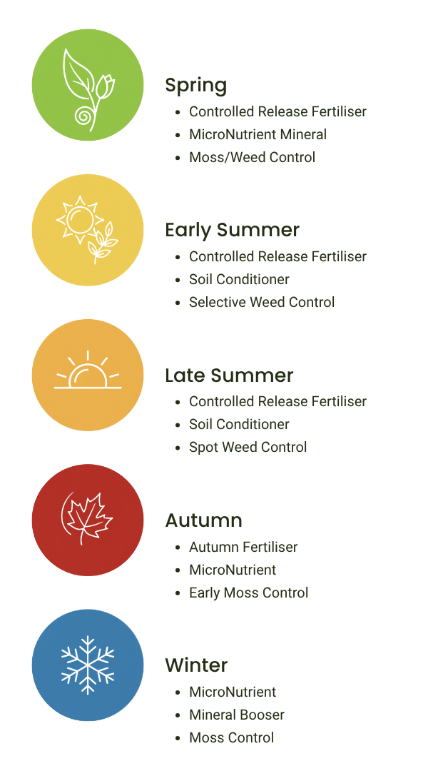 Our comprehensive lawncare programme is designed to build a healthy, resilient lawn through targeted treatments that address common issues like weeds and nutrient deficiencies. Regular applications improve soil structure, strengthen root systems, and help your grass thrive through seasonal challenges. By timing each treatment to match your lawn’s natural growth cycles, we ensure consistent results and a visibly stronger surface—year-round.